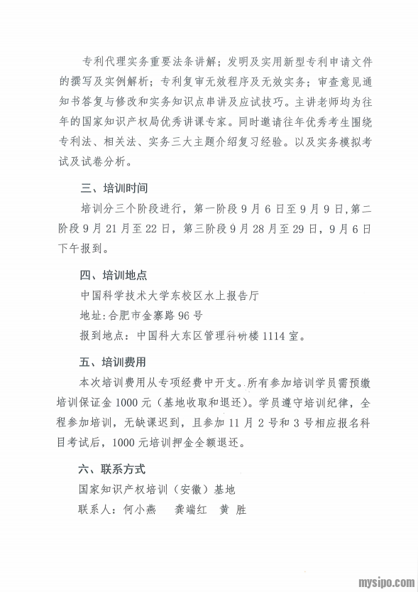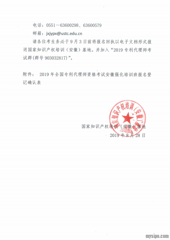 注意:请考生在9月3日前将报名回执以电子文档的形式发送至国家知识产权(安徽)基地。