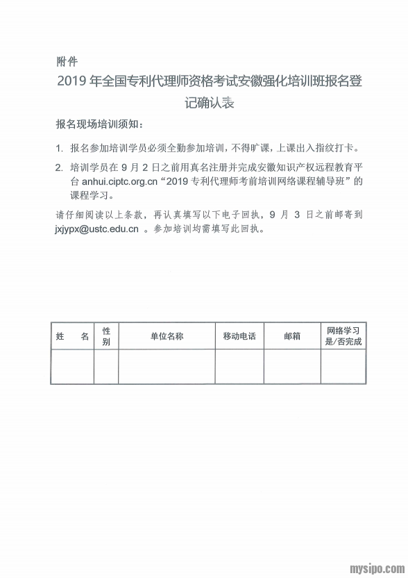 - 关于举办2019年专利代理师资格考试强化培训班的通知+报名登记表.pdf 下载