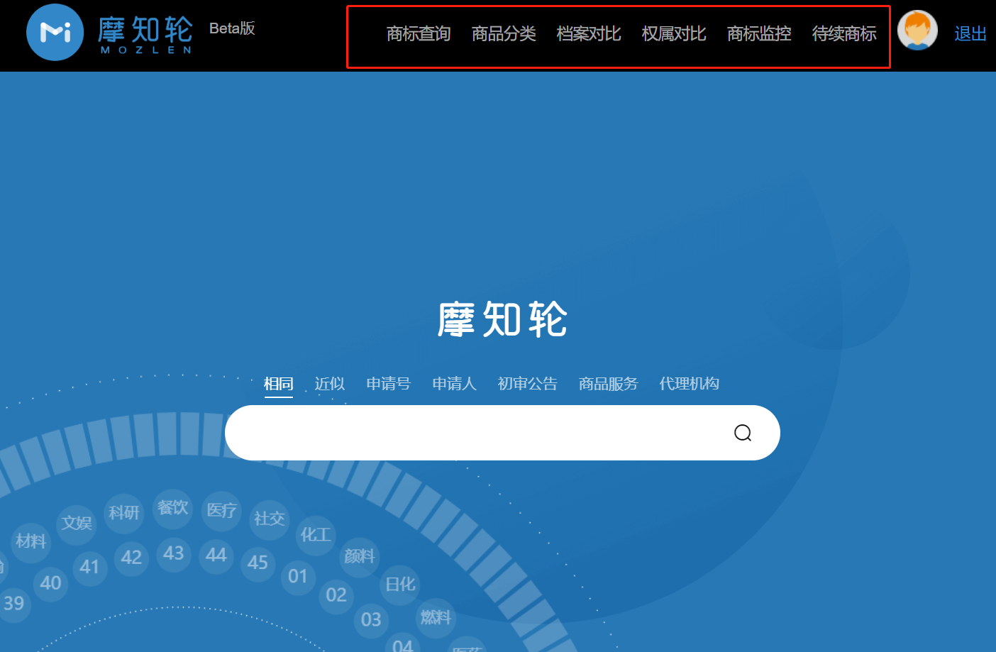 登录摩知轮后直接跳入如下图所示的界面,可以简单输入关键字开始商标检索。但是作为专业玩家,我们的检索入口在界面的上端(红框所示),分别是商标查询、商品分类、档案对比、权属对比、商标监控(未开放)、待续商标(未开放)。