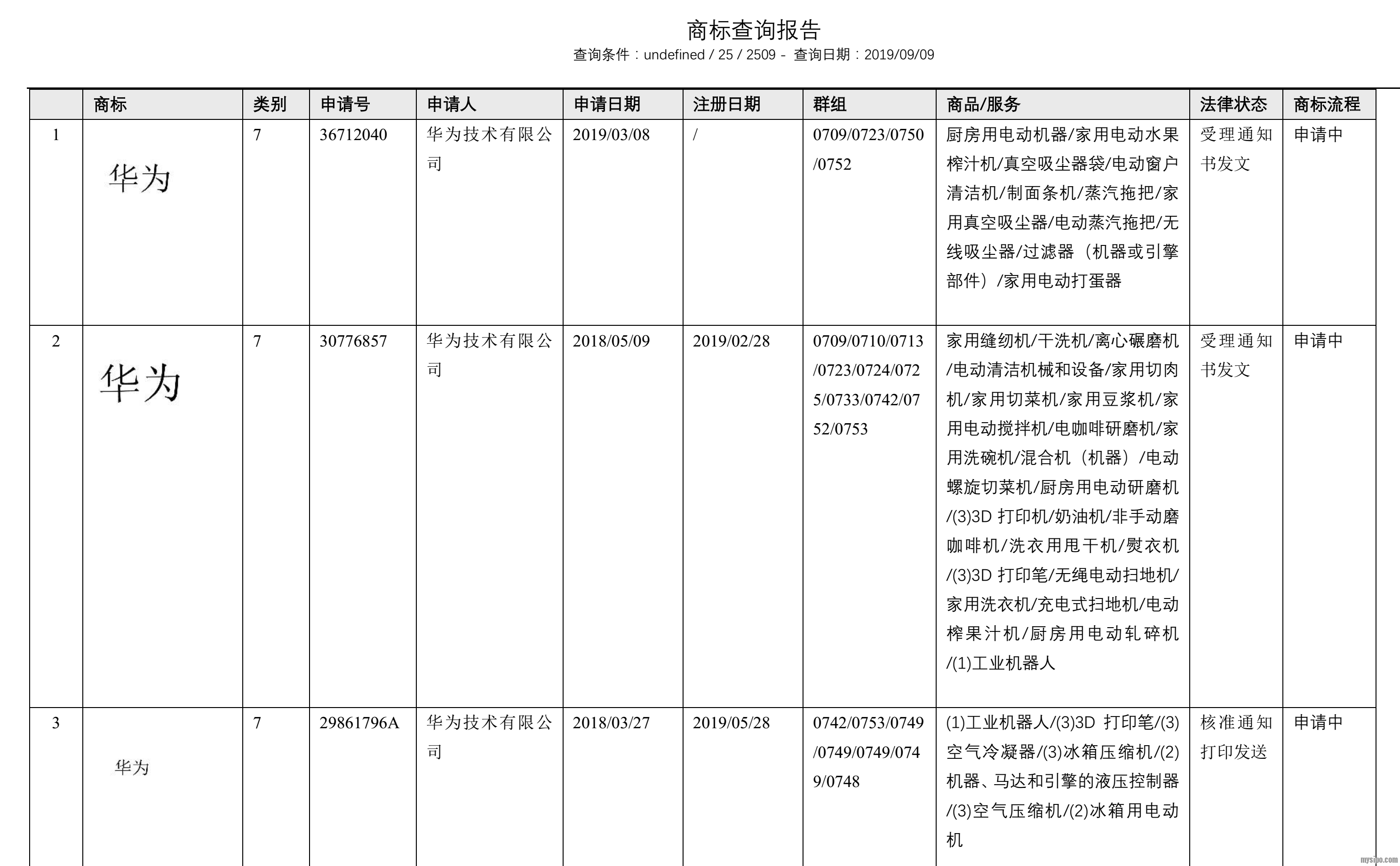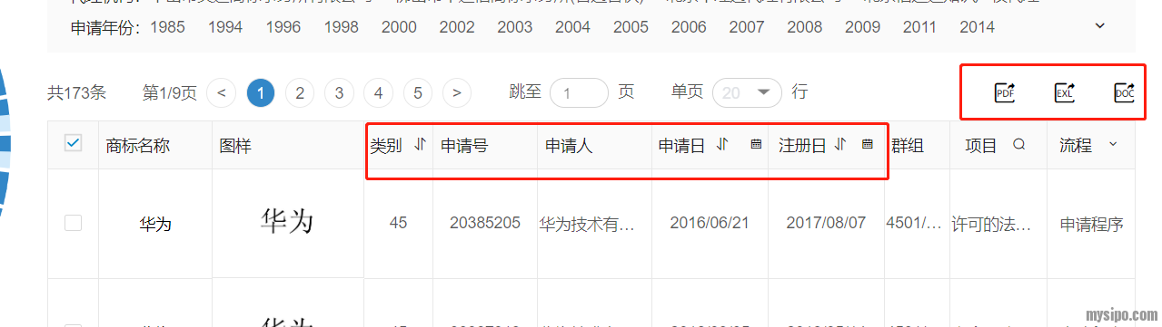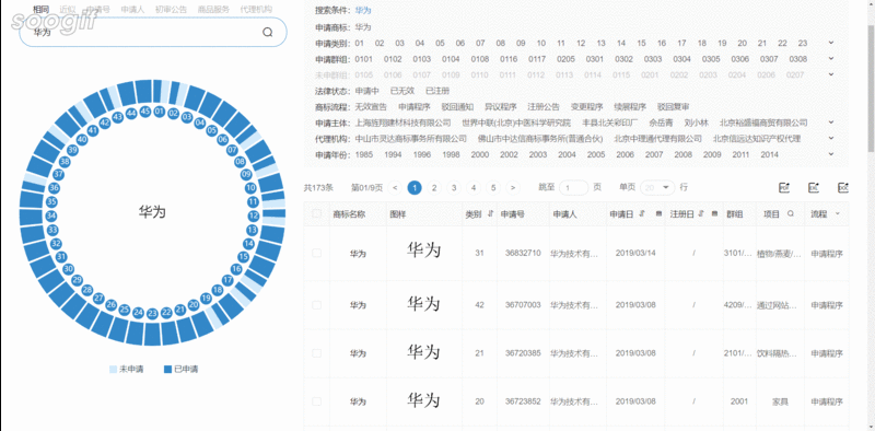 可以检索相同商标、近似商标、申请号、申请人、初审公告、商品服务、代理机构。例如:将商标名称“华为”输入检索框,即可得到“华为”在45类商标分类上的注册情况(深色:申请;浅色:未申请),点击商标类别,可查看具体的商标申请群组(下图)。