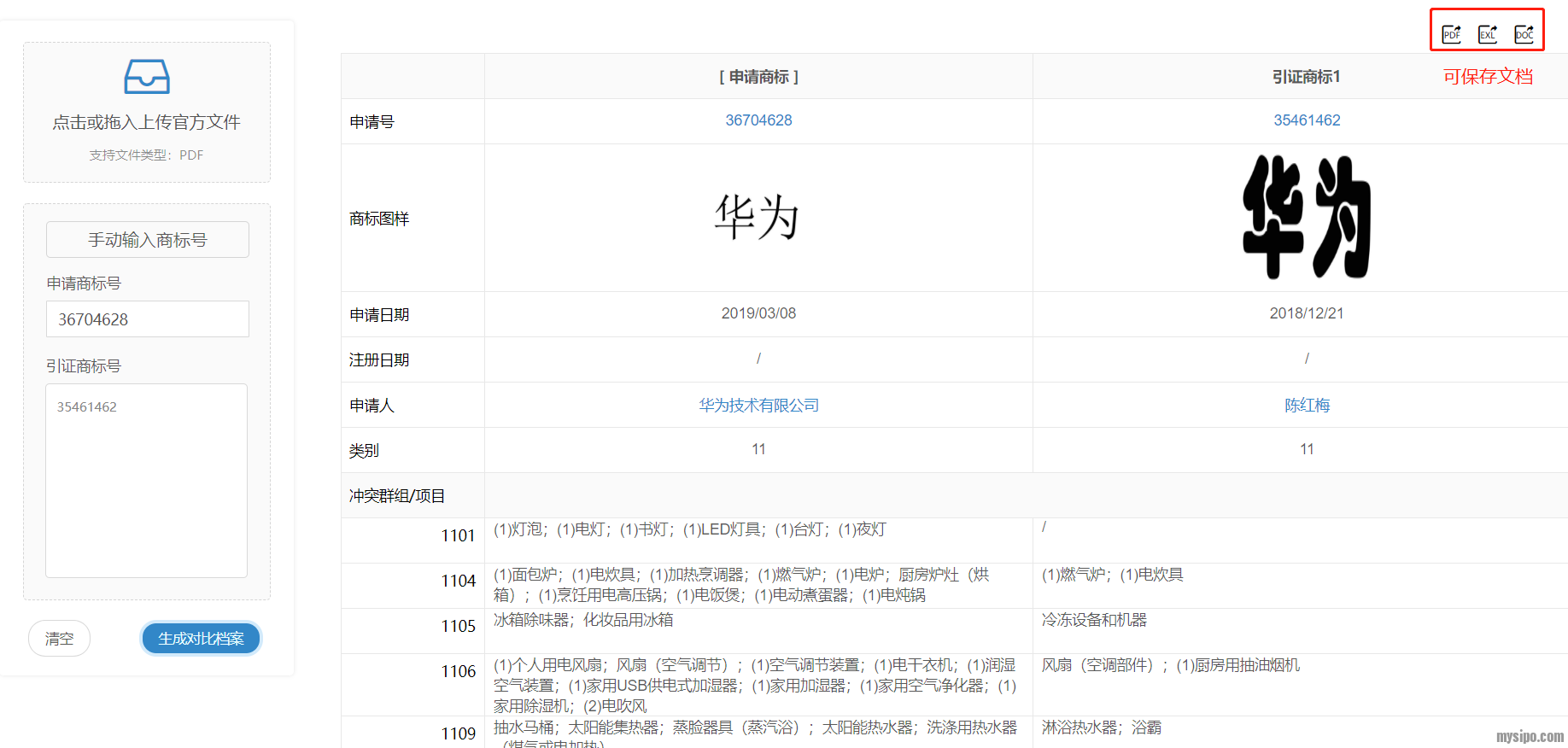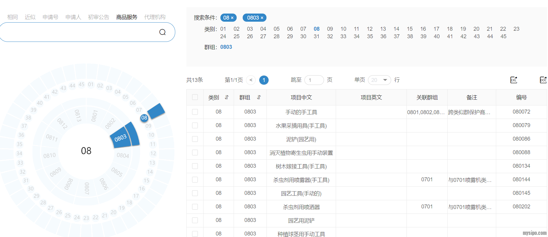 这个功能企业IPR应该很喜欢,将商标和企业名称输入,可以清楚看到自己的关注商标在哪些类别已经被其他公司先下手,一目了然。