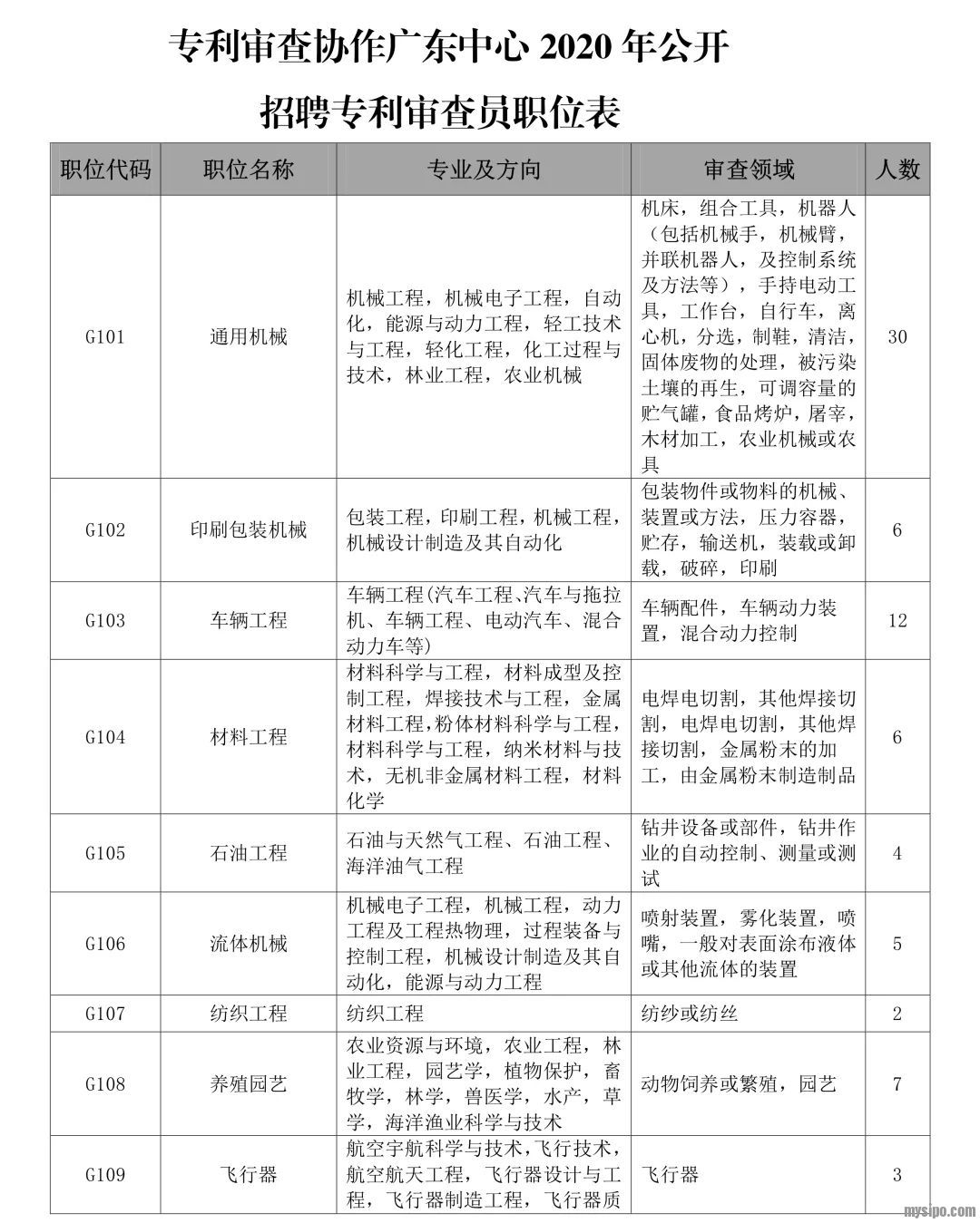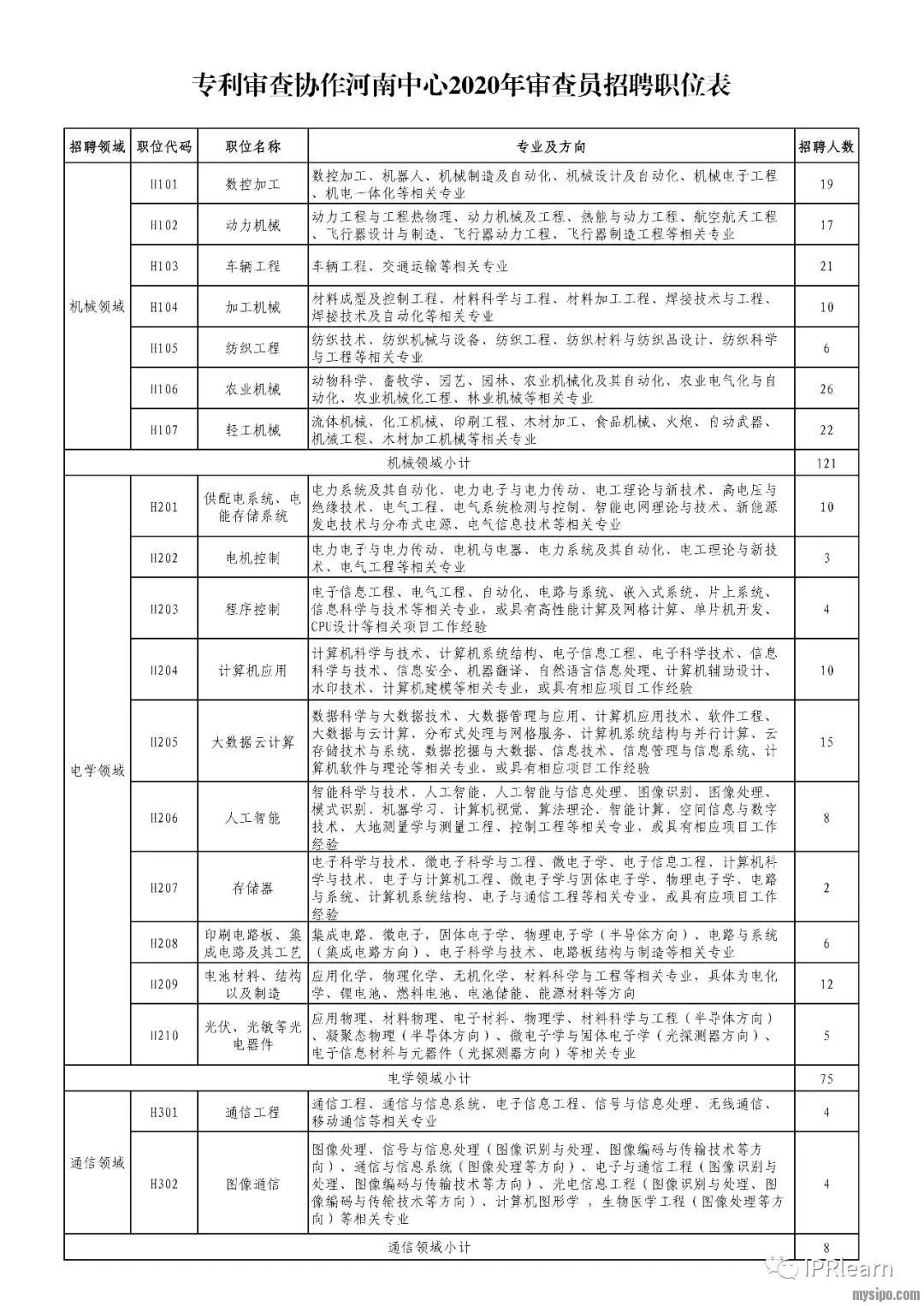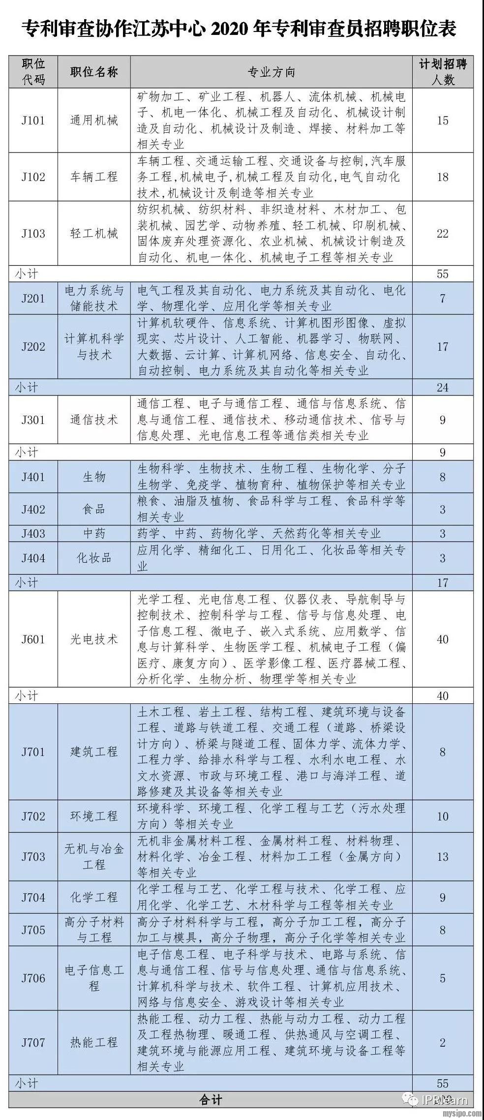 2020年专利审查员招聘需求详见文末《专利审查协作江苏中心2020年专利审查员招聘职位表》。
