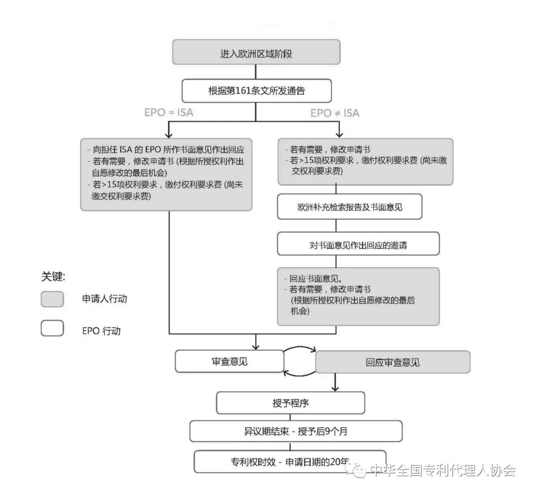 目前,向中国受理局提交的PCT 申请人,被请求做出补充检索报告频率较高的检索单位为欧洲检索局。与进入中国的专利申请的审查不同的是,根据PCT 进入欧洲阶段的专利申请包括两个阶段,即检索阶段和实质审查阶段。一般而言,中国申请人提出的PCT 申请在国际阶段的检索单位是中国国家知识产权局,而 EPO 对于国际阶段检索单位为非EPO的Euro-PCT 专利申请,会发出补充检索报告并附有关于专利性的补充检索书面意见。具体流程可见图 1。