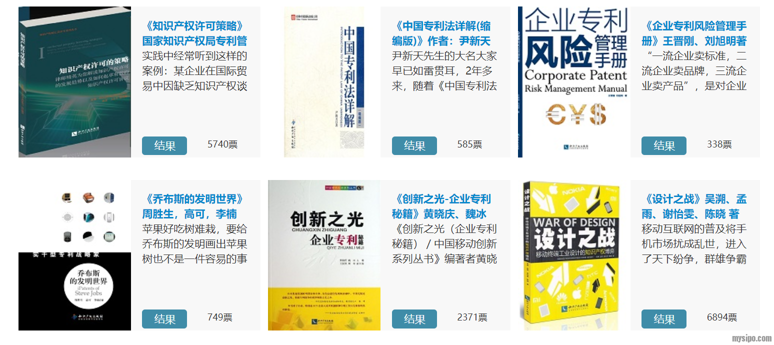 2014年,由思博网主办、来出书协办的“中国十佳知识产权图书”评选活动,参与评选的知识产权图书来自知识产权出版社专家推荐以及网友推荐,在线网络投票总数达到55848,通过网络投票初评和20名资深编辑作为专家评审团的复评,评选出最终的十佳知识产权图书。以下是评选结果,排名不分先后。
