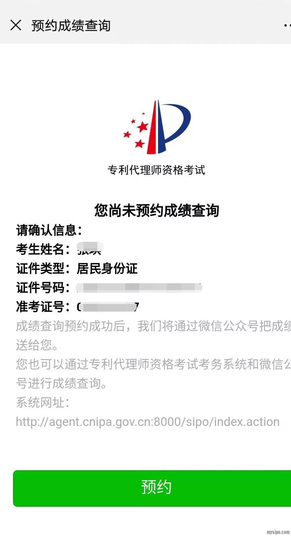 点击“预约”,成绩查询预约申请成功后,将在成绩查询开放(2019年12月1日0点)后通过“全国专利代理师资格考试”微信公众号将成绩推送给您。