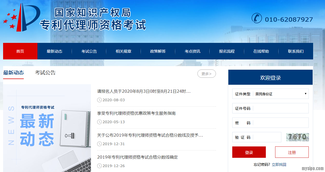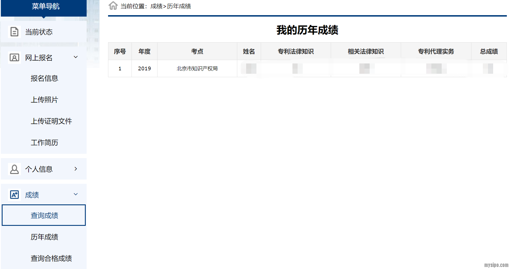 进入“专利代理师资格考试报名系统” 首页,输入证件号码和密码登录,在个人后台进行成绩查询。