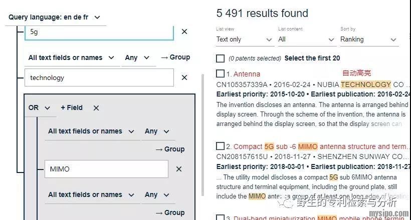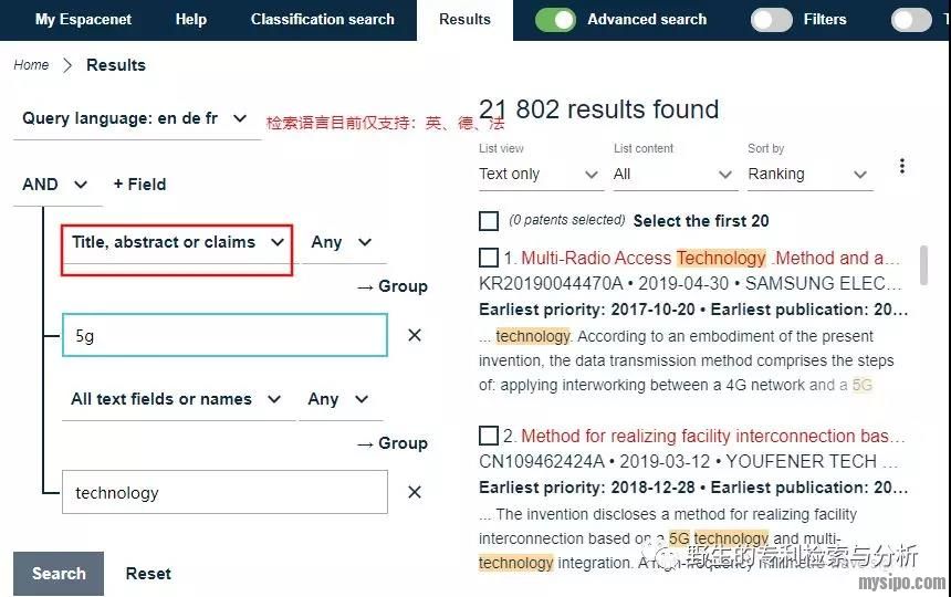 目前欧洲专利局推出了新版 Espacenet专利检索系统(site:https://worldwide.espacenet.com/beta/search),在检索功能部分,如下图所示,可以看到检索画面呈现的是阶层式布尔运算表格,使用者可以在空格处填入关键字,点选查询按钮后,画面右边即为检索结果。