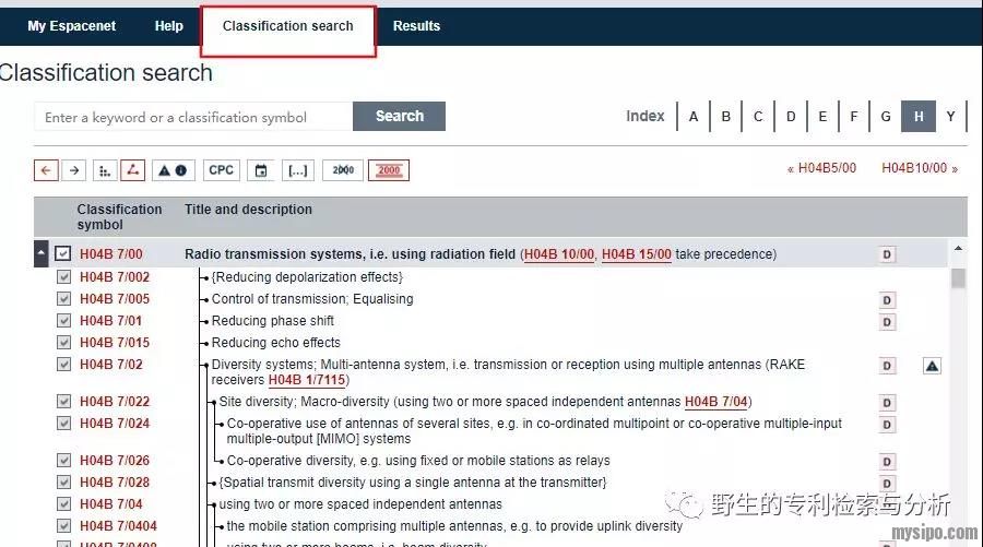需要进行 CPC 分类检索时,如下图,点选红框所示 “classification search”后,系统会显示分类表供使用者浏览分类及选取分类号。