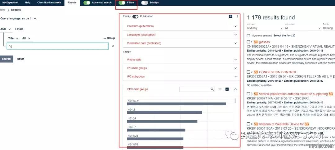 接下来介绍检索结果的过滤功能,方便使用者在众多检索结果中,筛选想要优先阅览案件,如下图,打开画面上方 “Filters” 选项,系统将显示可以过滤专利的选项,包括国家、语言、公告/公开日、优先权日、IPC、CPC、申请人、发明人等。点击任一选项后,将会有依统计排序的内容供使用者过滤专利,例如,点选 CPC 后,将显示检索结果依 CPC 统计结果排序,使用者点选具体的 CPC 后,右方即可显示筛选后的相关专利。