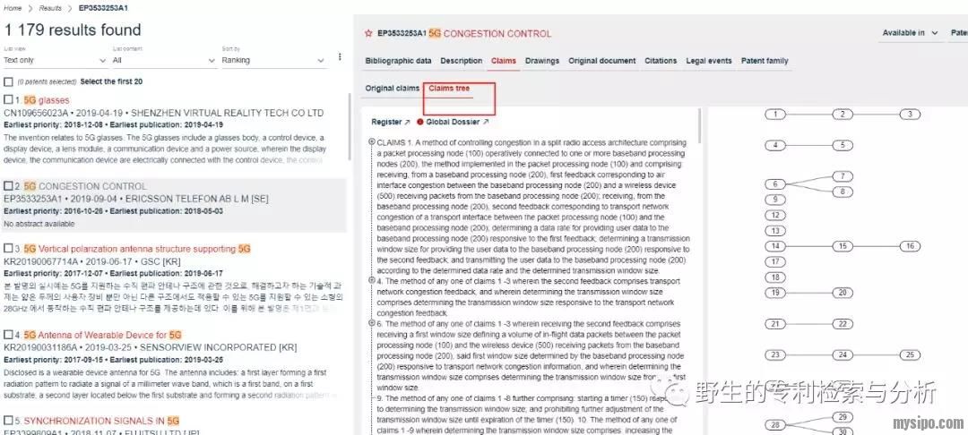 在浏览专利信息部分,当使用者点击特定专利时,系统提供有各项信息切换钮以供使用,包括著录项、专利权利要求、说明书、摘要、附图、引证信息、专利家族、法律状态等等,其中在专利权利要求部分,包含绘制 “Claim Tree” 功能,如下图。