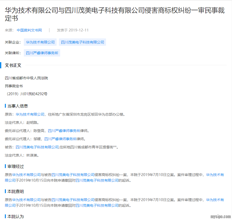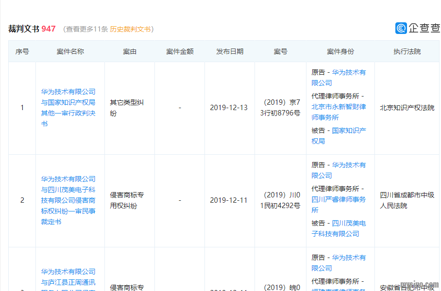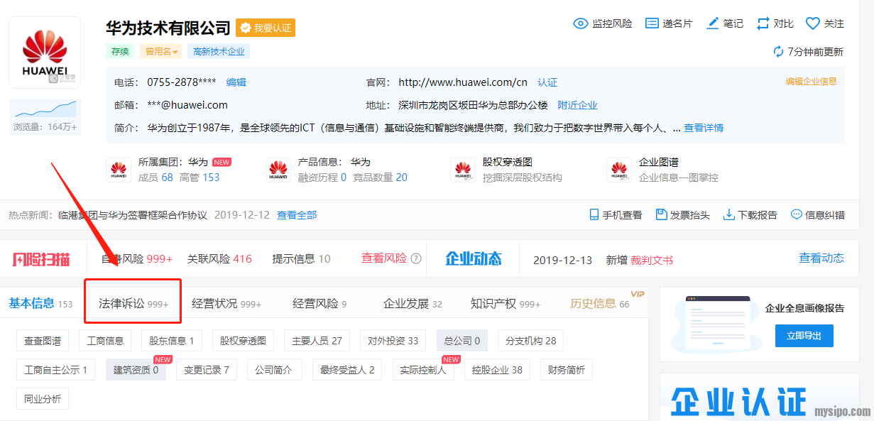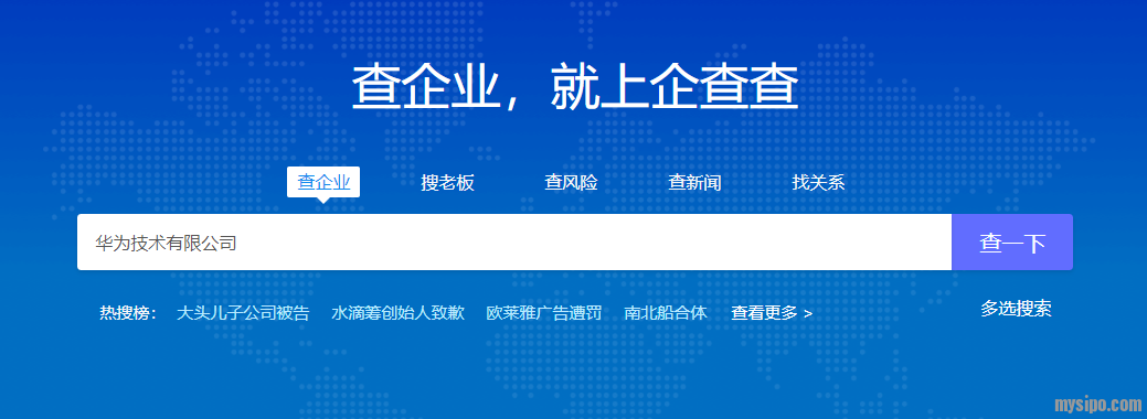 第三方企业信息网站以具体的企业为标的,收集于企业相关的方方面面的信息,其中也包含了知识产权相关的诉讼信息。第三方企业信息网站目前市面上有很多,本文就以企查查(https://www.qichacha.com/)为例简要说明,在检索框中输入“华为技术有限公司”。