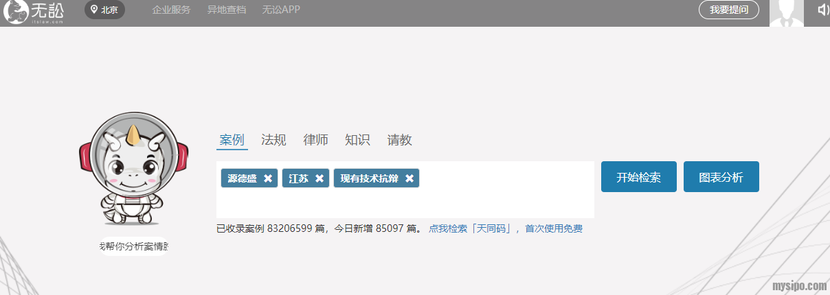专利诉讼数据检索一般可以在无讼、openlaw、法信等第三方数据库检索,等官网相比第三方数据库在界面、检索功能上具有很强的优势。以无讼(https://www.itslaw.com/)为例简要说明,在检索框中输入“源德盛、江苏、现有技术抗辩”。
