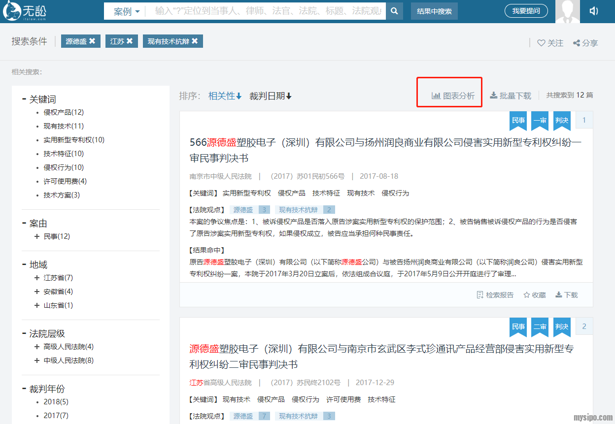 就可以检索到相关的裁判文书,点击右上角的“图表分析”还能换个角度从数据的分布、趋势上进一步研究。