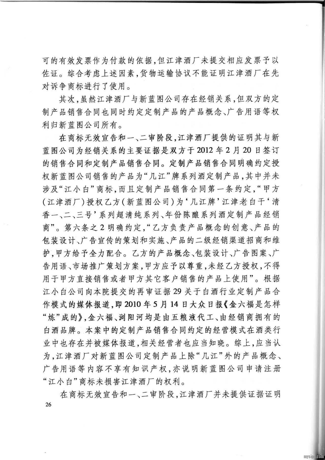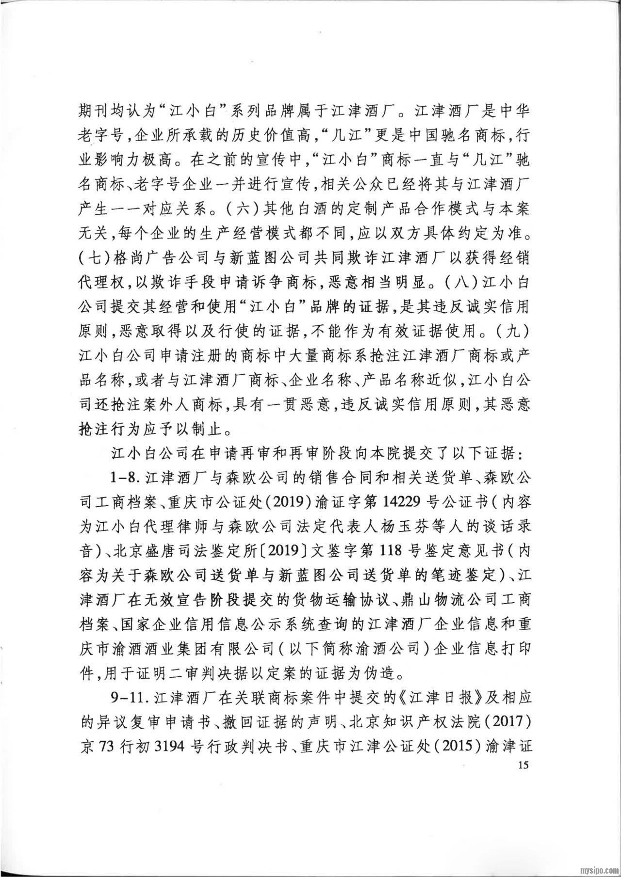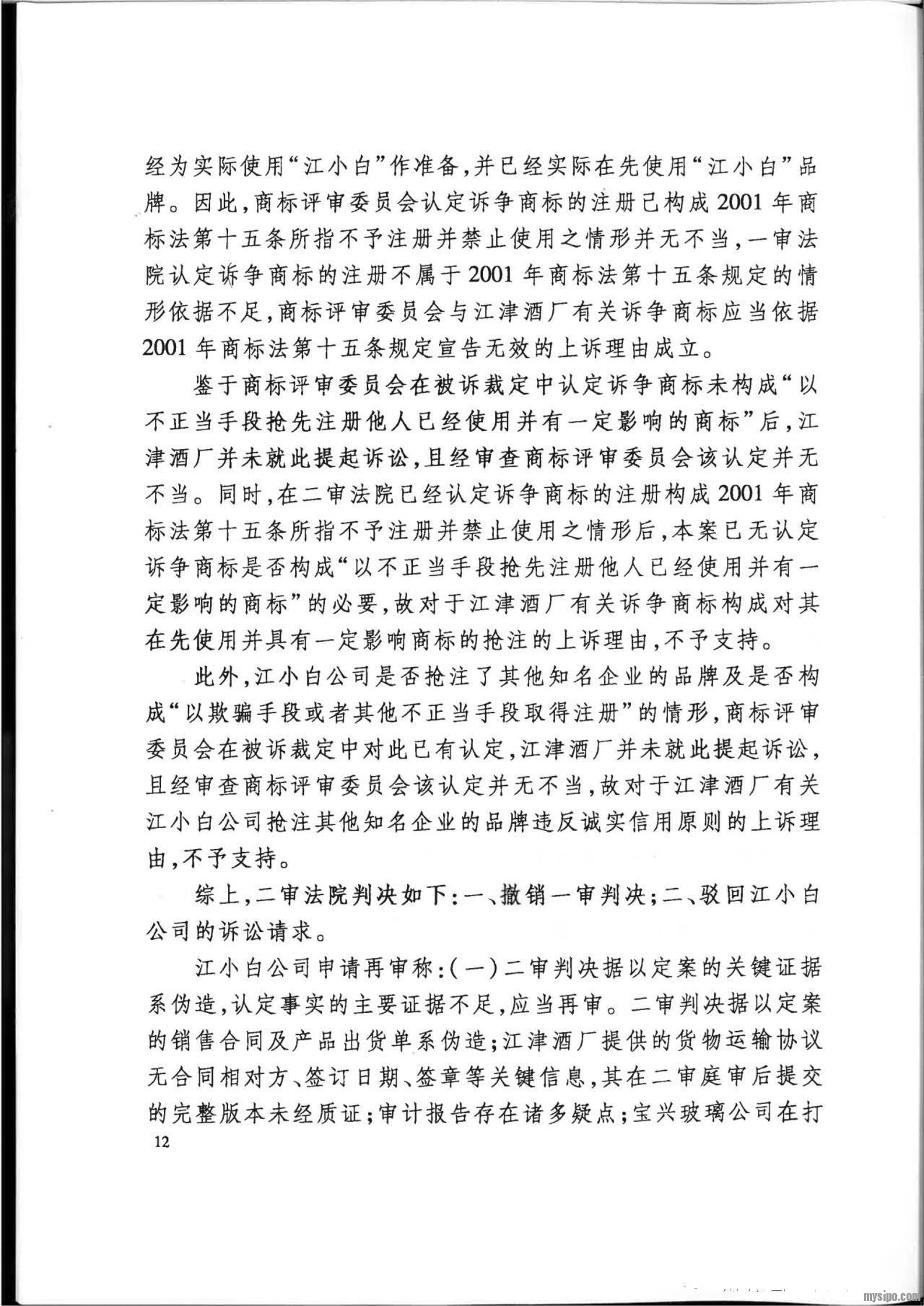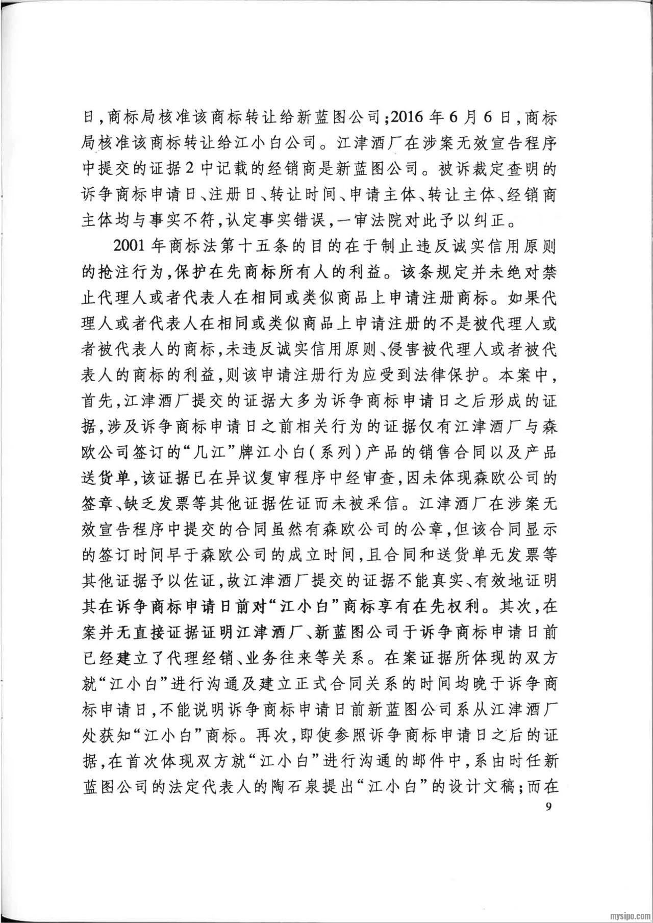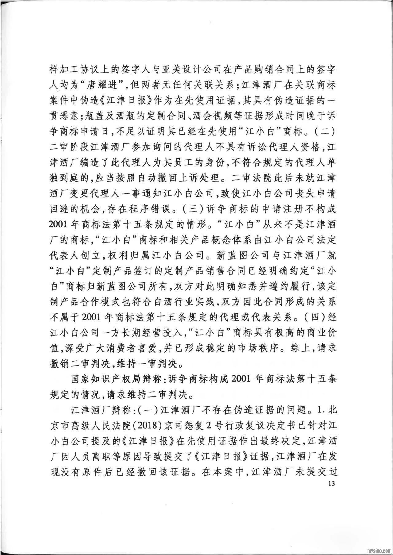 然而,江小白公司不服二审判决,向最高人民法院申请再审。2019年12月26日,最高人民法院认为:在诉争商标申请日前,“江小白”商标并非江津酒厂的商标,根据定制产品销售合同,江津酒厂对定制产品除其注册商标 “几江”外的产品概念、广告用语等并不享有知识产权,新蓝图公司对诉争商标的申请注册并未侵害江津酒厂的合法权益,未违反2001年商标法第十五条规定。