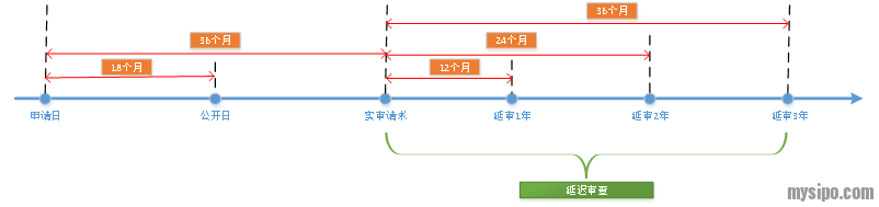 在涉及审查顺序的修改中,延迟审查制度是一项新制度,其只适用于发明专利和外观设计专利,其中,延迟审查请求应当由申请人在提出发明专利实质审查请求的同时提出,或在提交外观设计申请的同时提出,延迟审查期限为1年、2年或3年,自延迟审查请求生效日(或实质审查请求生效日)起计算。图1以发明专利为例指明了延迟审查期限的具体时间规定(注:在没有其他说明的情况下,本文所指专利都是以发明专利为例):