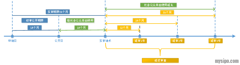 在发明专利申请中,有一类特殊情况,就是在实审 期 限 内( 即 自 申 请 日 起 —— 有 优 先 权 的 指 优 先 权日——3年内申请人可以随时提出实质审查请求),申请人放弃提出实审请求且不恢复权利,此时该公开的发明专利申请就相当于无偿捐献给社会公众,任何个人或组织都可以自由使用而无侵权之风险。然而,延迟审查制度的推出,将在发明专利申请中这一特殊情况下,大幅延长社会公众对该公开专利的自由使用之期限,额外延长的期限最长可达3年之久,最短也有1年时间(详见图2):