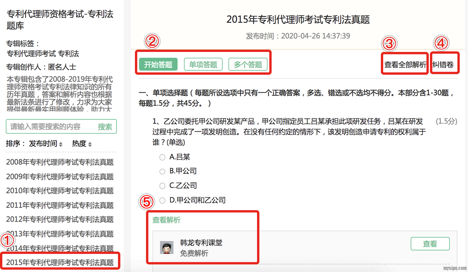 专利代理师考试题库的解析,我们做了两个功能,一个是付费精华解析,看中了哪个老师可以直接购买使用(现在已开放给大家免费使用);一个是集大家智慧一起,通过优秀的评论互动,择优选取推荐建设的开放版题库解析,充分给大家提供学习讨论体验。