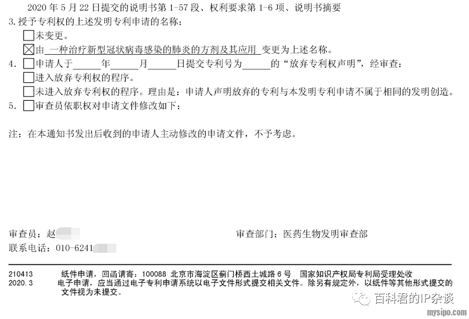 根据5月22日申请人提交的最新版本权利要求,药物方剂和治疗新冠肺炎的用途都获得了授权,具体内容如下: