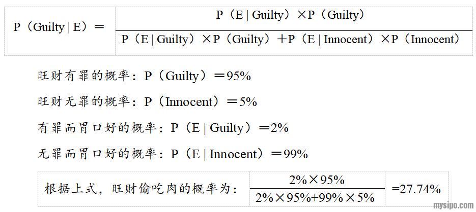 贝叶斯定理的概率计算起来比较复杂,但可以举个简单的示例予以说明。某发现自己放在厨房解冻的一大块熟肉不翼而飞,根据他的经验该肉有95%的概率进了狗主子“旺财”的肚里,于是准备举起棍子和旺财好好的讲一番道理。出于谨慎考虑,铲屎官决定搜集更多的“罪证”,让旺财无可抵赖。于是铲屎官像往常一样给旺财准备了晚饭,而旺财也一阵风卷残云的吃得干干净净。铲屎官清楚,如果旺财预先偷吃那块肉,晚饭还有好胃口的概率是2%。在平时情况下,旺财胃口好的概率则是99%。在新证据加入后,根据贝叶斯定理,旺财偷吃那块肉的概率一下子降低为27.74%,很有可能是清白的。[8]