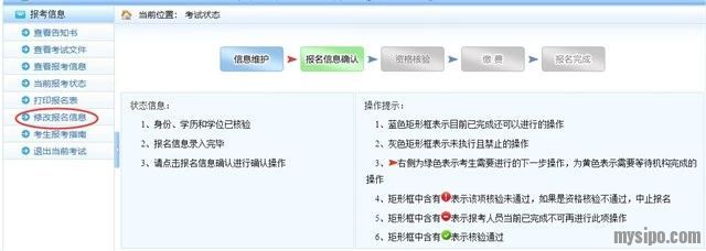 3.报名确认或资格核验后,如左侧菜单无“修改报名信息”选项,考生则不可自行修改报名信息。