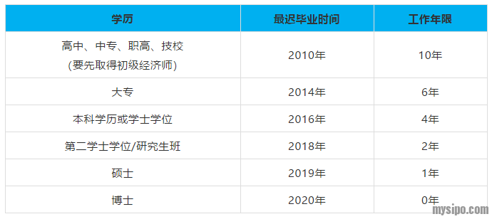 2020年中级知识产权师报名学历及工作年限对应关系如下: