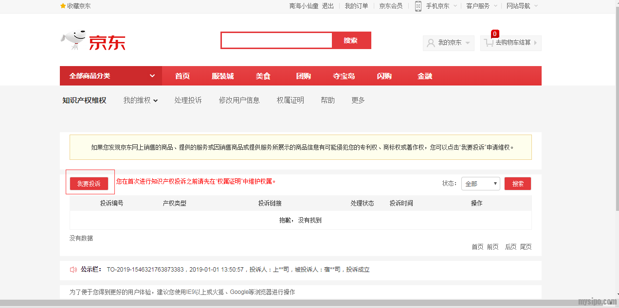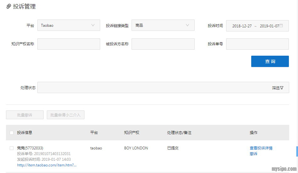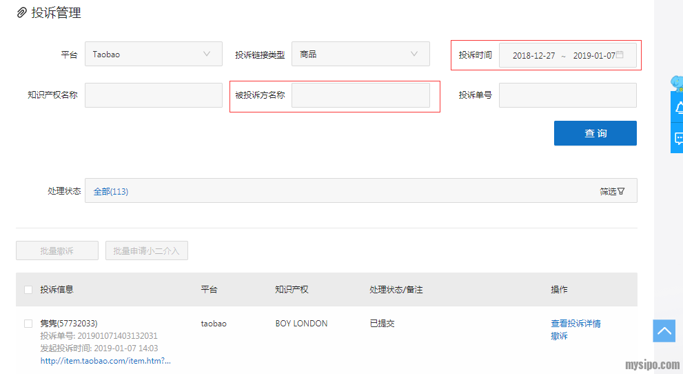 2.可选择投诉时间.侵权店铺等点击查询查看信息