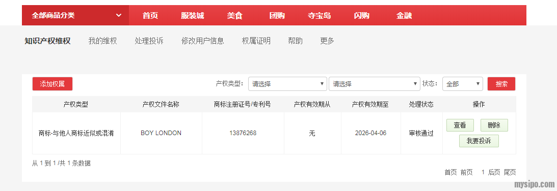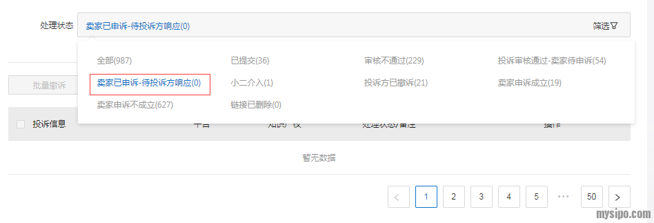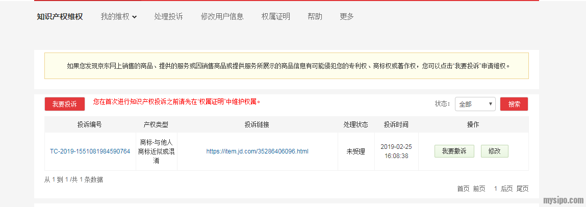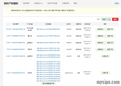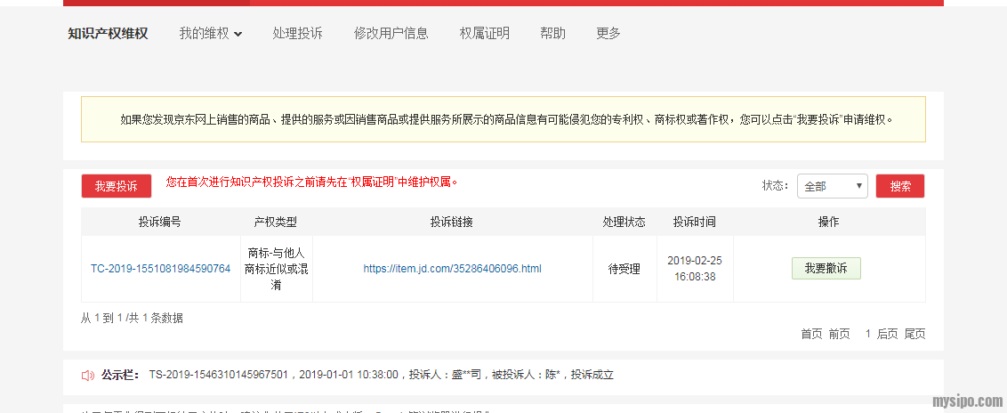 1.点击“知识产权维权-处理投诉”菜单,进入被投诉方处理维权界面;