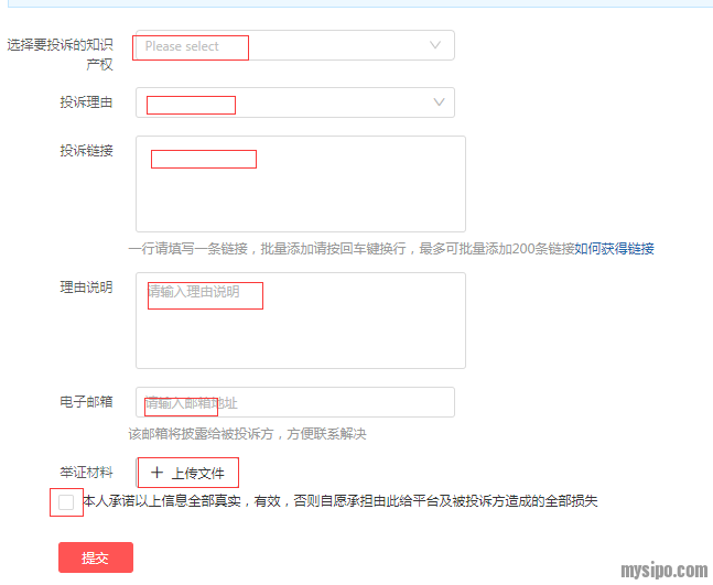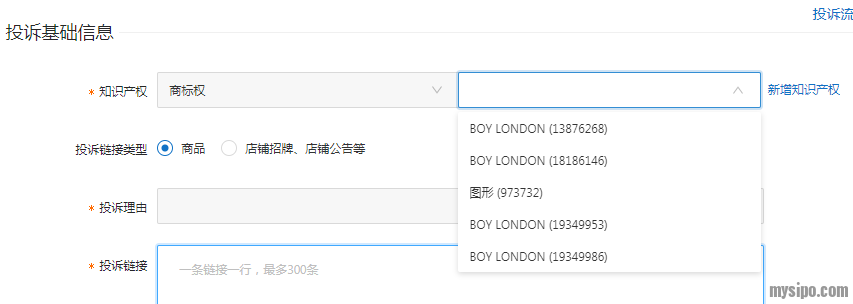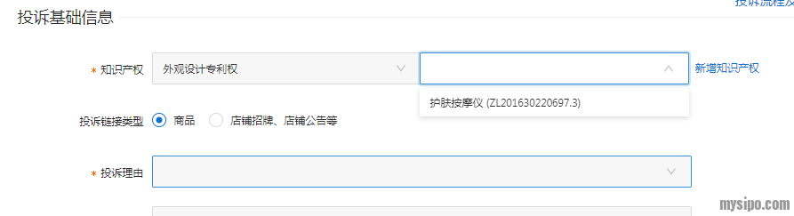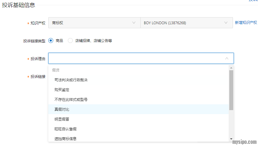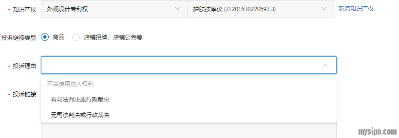 3.填写商标权或专利权以及对应申请号;投诉类型链接:选择商品