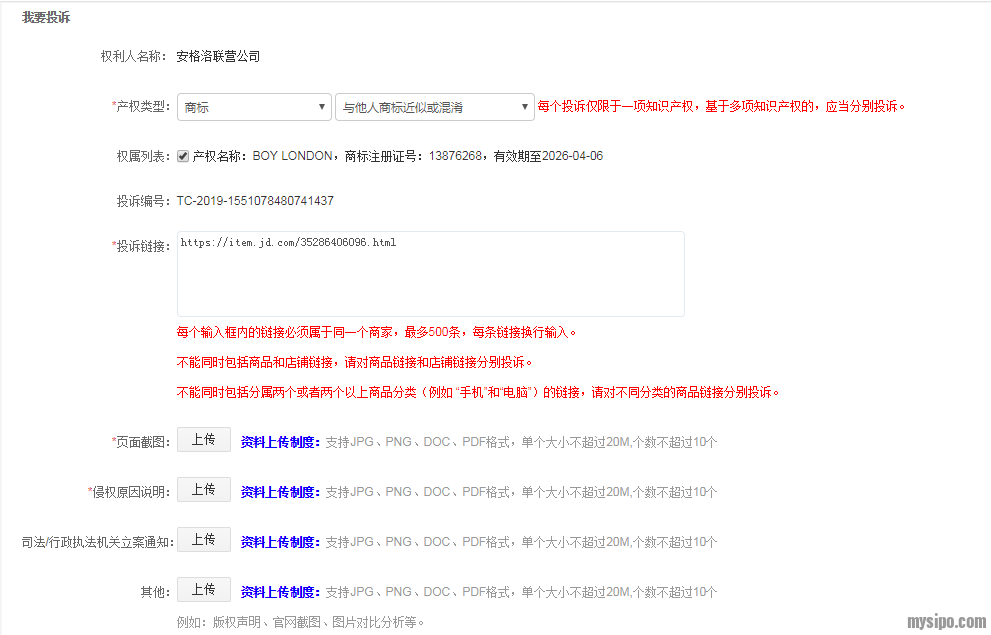 3.输入投诉链接,上传侵权页面截图及侵权原因说明,投诉说明中做适当解释补充。