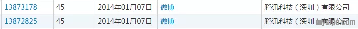 而腾讯公司第一次申请“微博”商标是在2014年1月7日,被注册在第45类上,足足晚了新浪将近5年的时间。