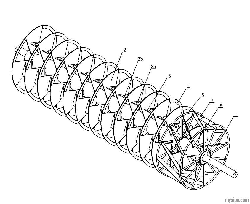 各桨叶2的外缘通过螺带4依次连接。采用大桨叶推进,桨叶2的外缘设有连续螺带4,可以大大减少饲料在筒体内壁的残留。