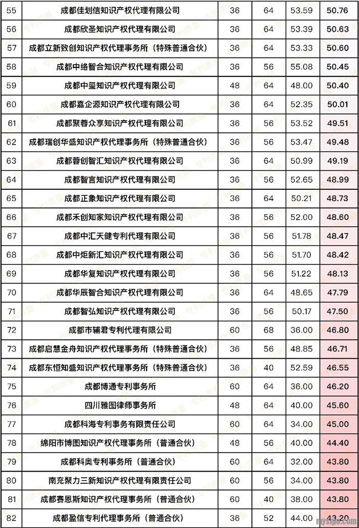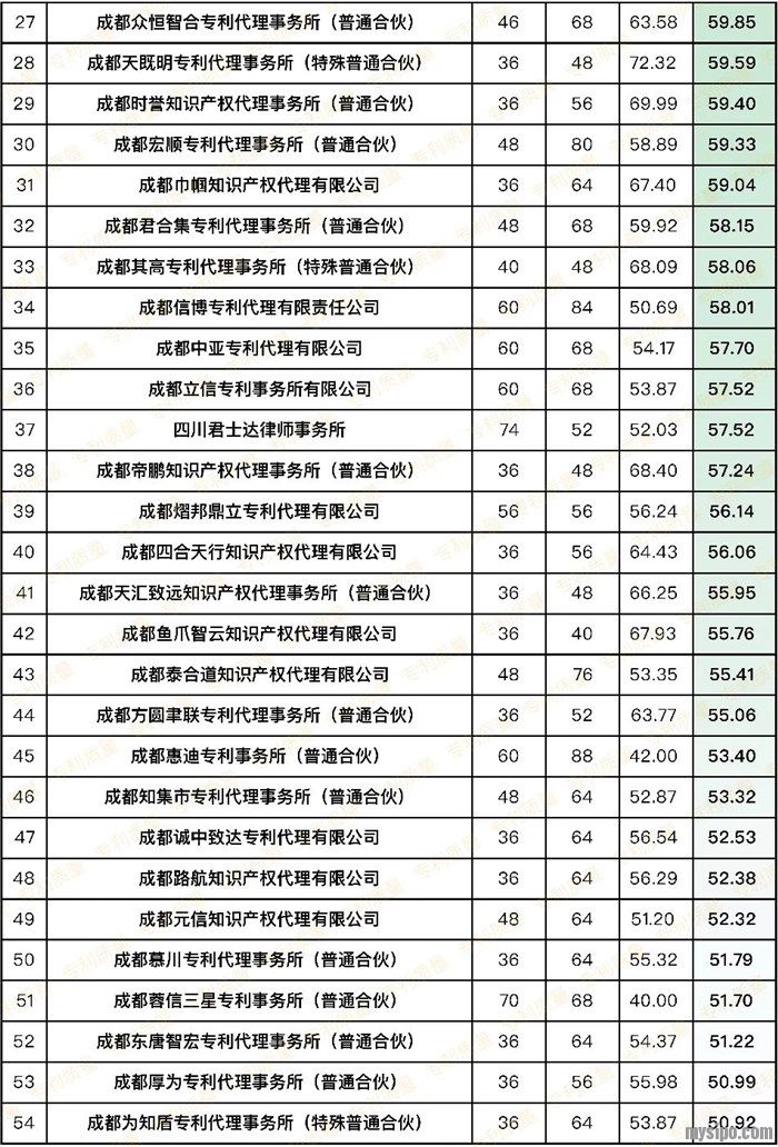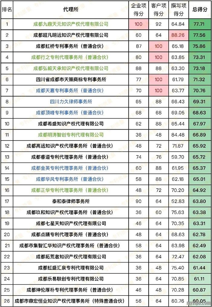 在撰写项中,34家代理所超过60分,其中在四川省内的代理所中,撰写项排到前五名的代理机构的得分均在70分以上。进一步的纵观全表,可以看出成都代理所在撰写项上出现了严重的两极分化,撰写分数从前往后跌落的较为明显,这也可能是导致撰写项平均分变低的重要原因。