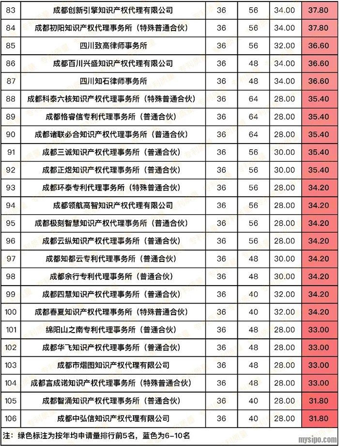 如上图所示,在四川省有代理专利数据的代理所共计106家,通过上表可以得出: