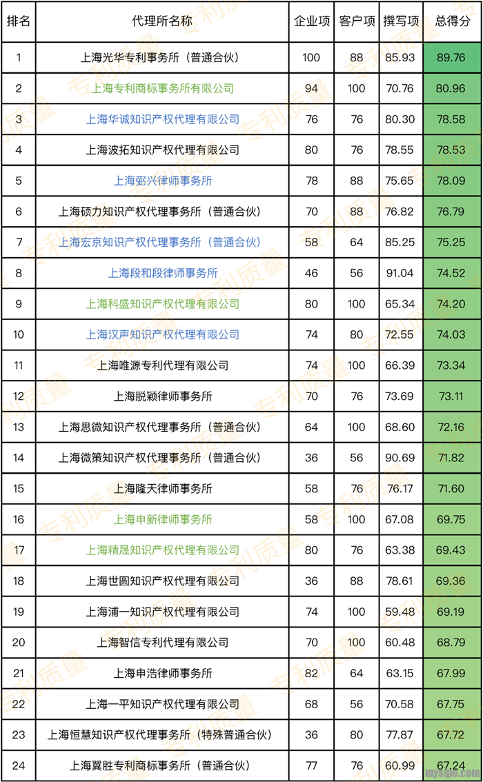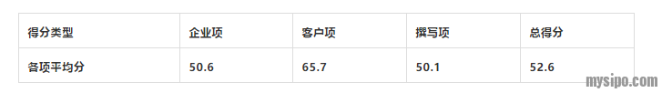 客户项这一栏中,上海市内代理所得分超过60分与等于且低于60分的代理所数量比为126:51;从这比例看出,该地区代理所的客户质量较高,申请人中企业的占比较多。
