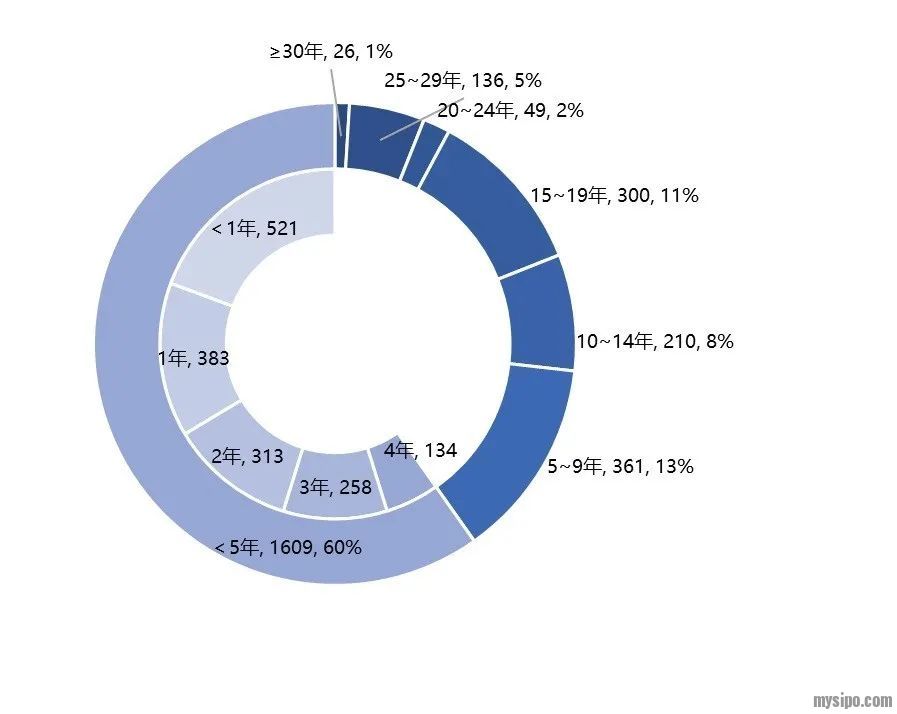 如图2所示,在2691家专利代理机构中,从专利代理机构的成立时间来看,成立20年以上的专利代理机构有211家,占全国专利代理机构总量的7.95%;成立10年至19年(满10年不足20年,以下同此划分方式)的专利代理机构为510家,占比19%;成立3年至9年的专利代理机构为753家,占比28%;成立时间在3年以内的专利代理机构为1217家,占比45.2%。