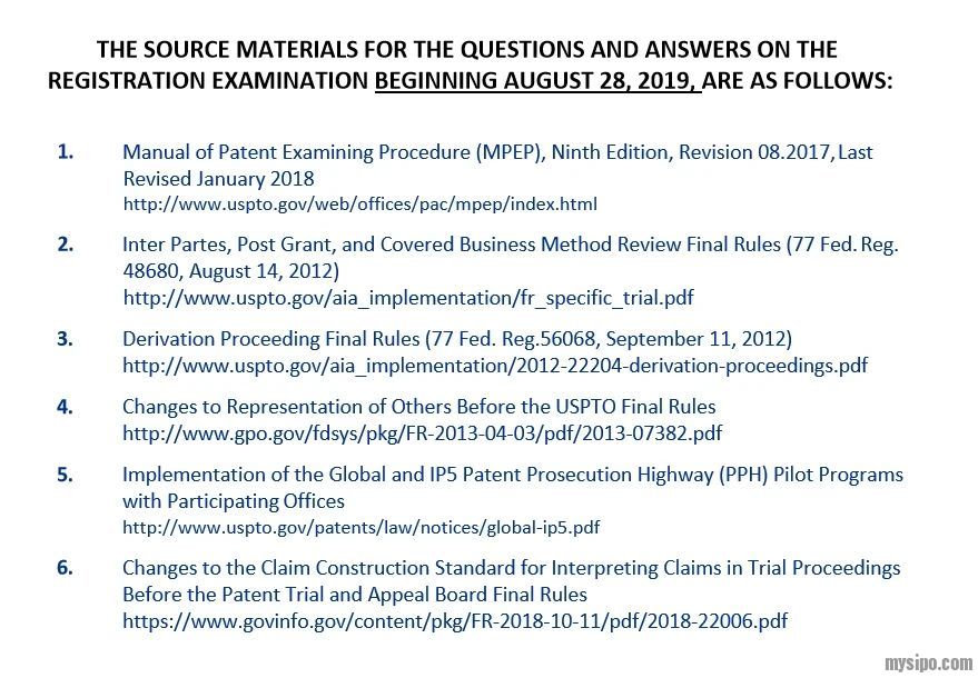 注册专利代理人考试范围包括美国专利法规以及专利申请等程序方面的规定,内容主要源自美国专利法35 U.S.C.、联邦法规37 C.F.R.中涉及专利部分(类似于中国的《专利法实施细则》)、以及美国专利商标局出版的the Manual of Patent Examination Procedure(MPEP),MPEP与中国的《专利审查指南》类似,但其内容更详细、更具体。美国专利商标局会不定期地以公报形式更新公布注册专利代理人考试范围,包括指定所使用的MPEP版本及考试涉及的USPTO已经颁布的规章制度等。由于美国的MPEP内容非常全面而详细,且书后附有相应美国专利法规,故考生准备考试时应以MPEP为主要复习材料。目前,考试使用的是2018年1月修订的第9版MPEP。