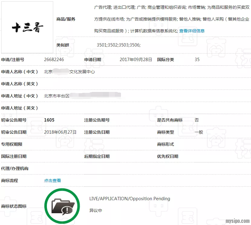 经查询,只有一家公司在第35类上申请了“十三香”商标,第9类没有相关注册信息。