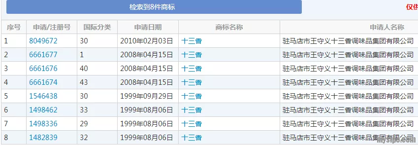通过商标检索,蜗牛纳看到王守义十三香集团只申请了8件“十三香”商标注册,所在类别中没有第9类和第35类。