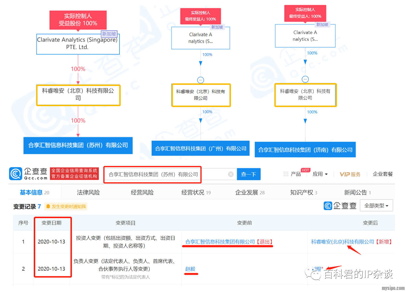 这七家公司目前都由科睿唯安100%控股,法人全部变更为刘煜。