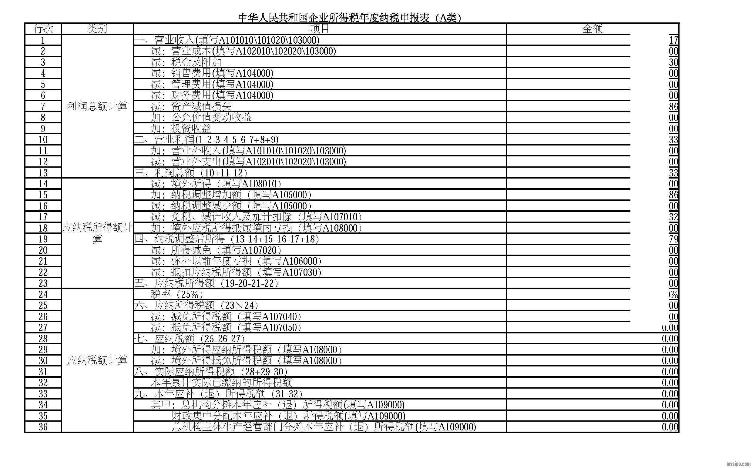 2. 中华人民共和国企业所得税年度纳税申报表(A类);(上年纳税不超一百万即可。)
