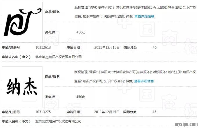 确实,我们纳杰知识产权只将“纳杰”的图形和文字进行了商标注册,均在第45类上:版权管理; 调解; 法律研究; 计算机软件许可(法律服务); 诉讼服务; 域名注册; 知识产权监督; 知识产权许可; 知识产权咨询; 仲裁。