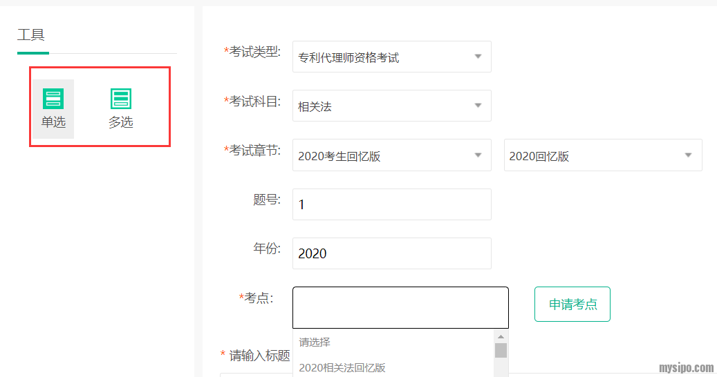 2、进入发布试题页面,左侧,选择“单选”或“多选”(指的是你即将录入的这道题是单选题还是多选题)