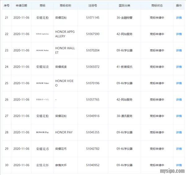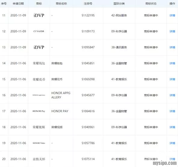 其中“荣耀视频”的商标国际分类涉及教育娱乐、科学仪器;“荣耀钱包”的商标国际分类为**物管,“荣耀花粉”的商标国际分类为**物管、通讯服务、科学仪器、教育娱乐。