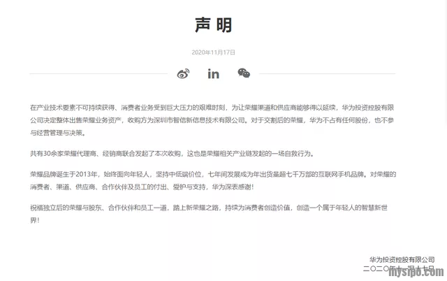 11月17日早上,华为发布声明表示,在产业技术要素不可持续获得、消费者业务受到巨大压力的艰难时刻,为让荣耀渠道和供应商能够得以延续,华为**控股有限公司决定整体出售荣耀业务资产,收购方为深圳市智信新信息技术有限公司。