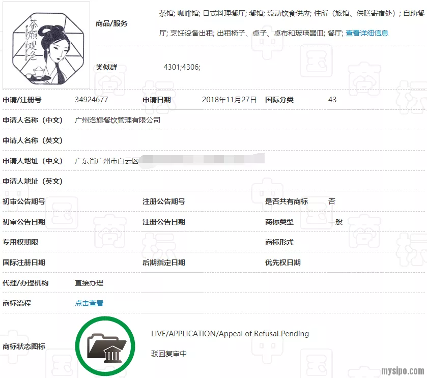 改了字体还不够,广州洛旗餐饮为标志加上了人物形象,这一改便于“前辈”茶颜悦色极为相似,该公司很快于2018年11月27日申请商标,目前该商标状态图标显示为“驳回复审中”。