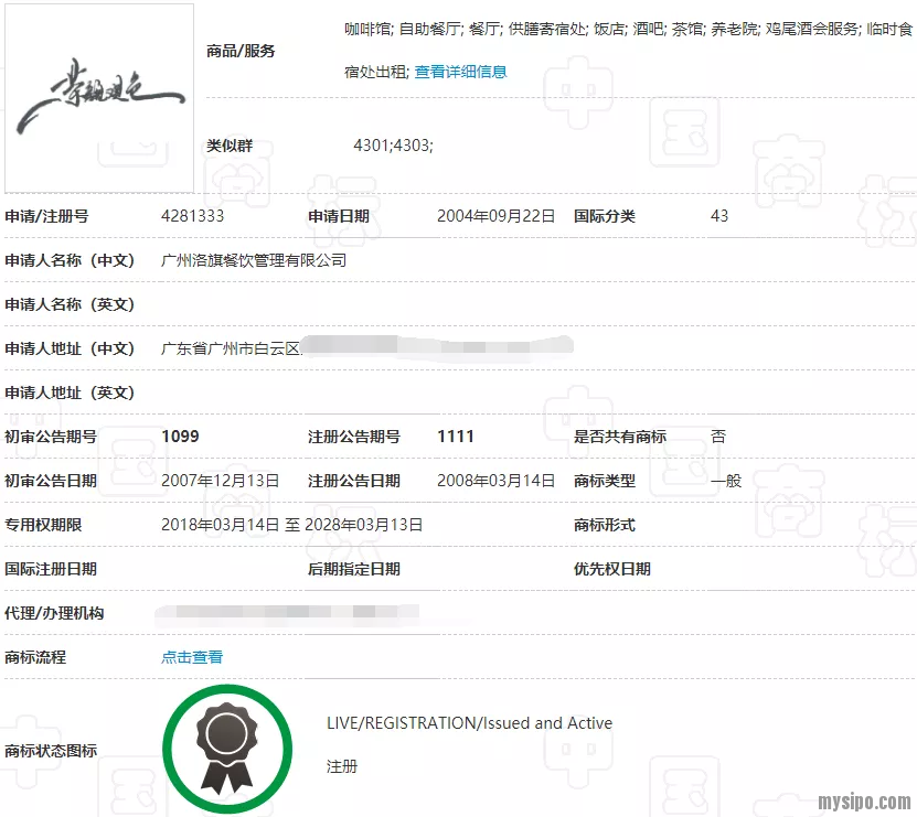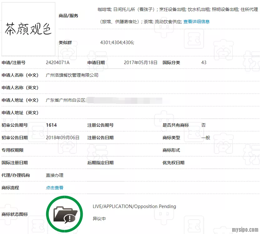 而最早的“茶颜观色”商标则是广州洛旗餐饮管理有限公司(下称广州洛旗餐饮)在2004年9月22日申请注册,起初图标为毛笔字体的茶颜观色四个字,和现在使用的字体以及茶颜悦色的字体差别很大,上面没有女子图案,商标状态图标同样显示为“注册”。