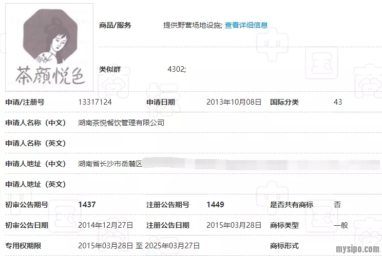 “茶颜悦色”商标是湖南茶悦餐饮在2013年10月8日申请注册的,该商标上有手执扇子的古风女子图案,其商标状态图标显示为“注册”。