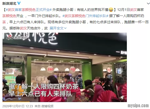 据悉,12月1日,茶颜悦色的首家武汉分店刚开业就排起了几百人长队,而这个消息也立刻冲上了微博热搜,阅读量高达7亿。并且官方微博显示:队尾的排队时长预计为8小时,且每人限购4杯。