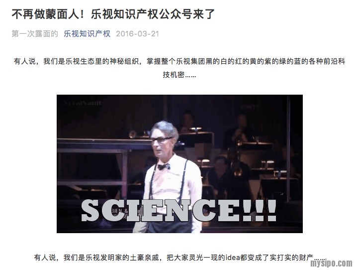 乐视知识产权微信公众号于2016年3月21日发出了第一篇文章,在接下来的几个月是基本每天对知识产权部门工作进行报道,但年底之后基本是转载文章,直至2017年6月29日发生终篇,仅活跃一年三个月。