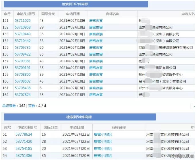 只不过,河南博物院并非最早申请此类商标的申请人,从商标局检索来看,目前共有162件“唐宫夜宴”及54件“唐宫小姐姐”商标正在申请中,其中有不少除河南博物院以外的公司或个体户在更早时间申请相关商标。